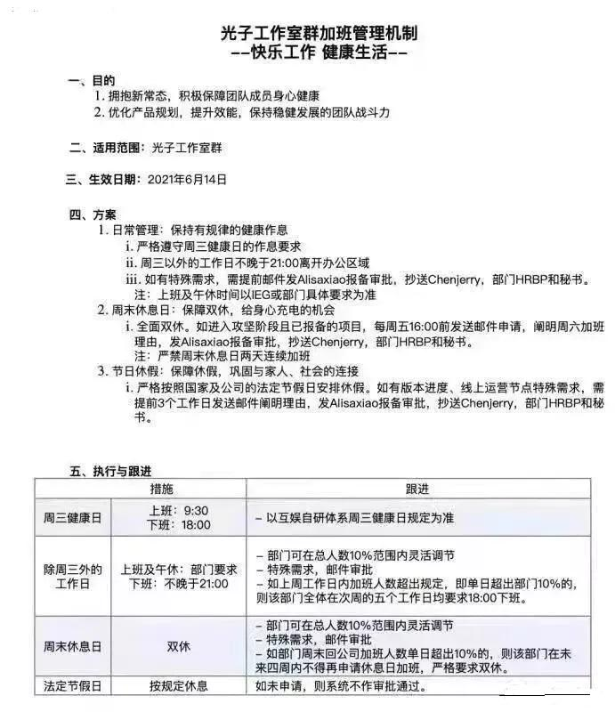 6月9日,騰訊員工發(fā)表了一份名為“如何看待IEG光子工作室要求不加班”的帖子,其中詳細講述了騰訊光子工作室的加班機制,“公司保障員工雙休及節(jié)假日休假;周三18點必須下班,其余工作日必須早于21點下班;雙休及節(jié)假日加班需提前申請獲批,否則將面臨18點強制下班的‘處罰’。”